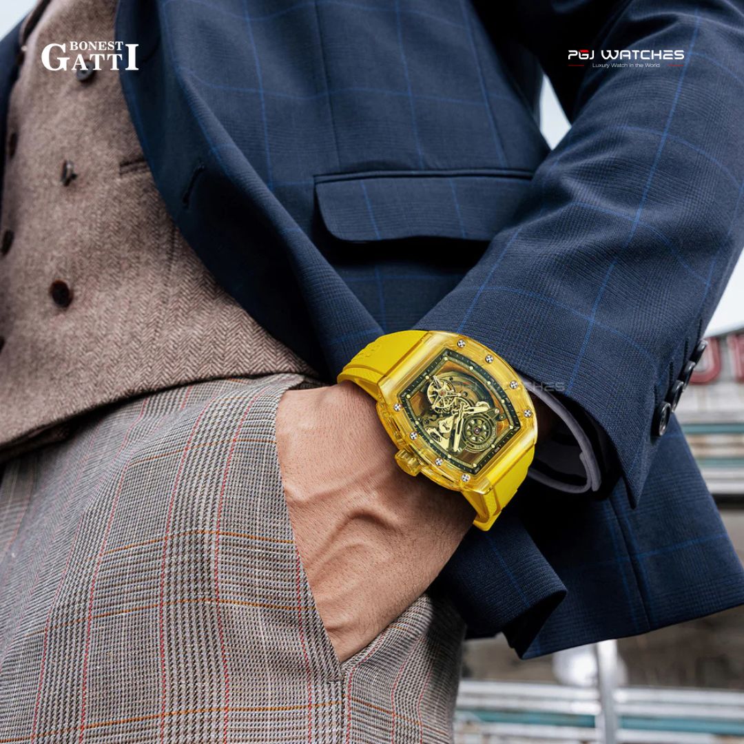 BONEST GATTI Tourbillon K9 Crystal Transparent Case Tonneau Skeleton Movement Watch Fluororubber Strap - BG7001-R