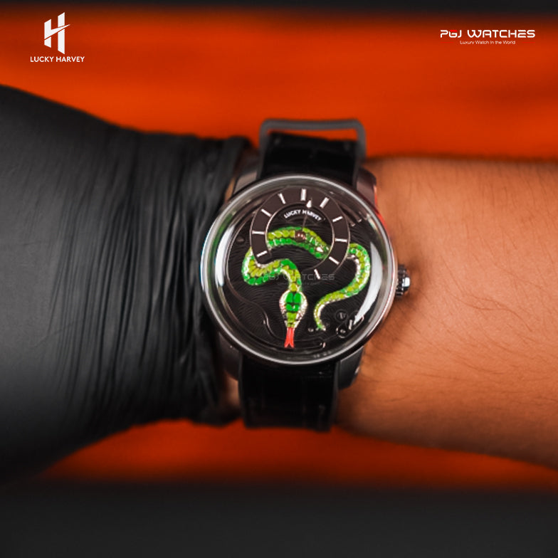 LUCKY HARVEY Gold Enamel Snake Automata Chiming Mechanical