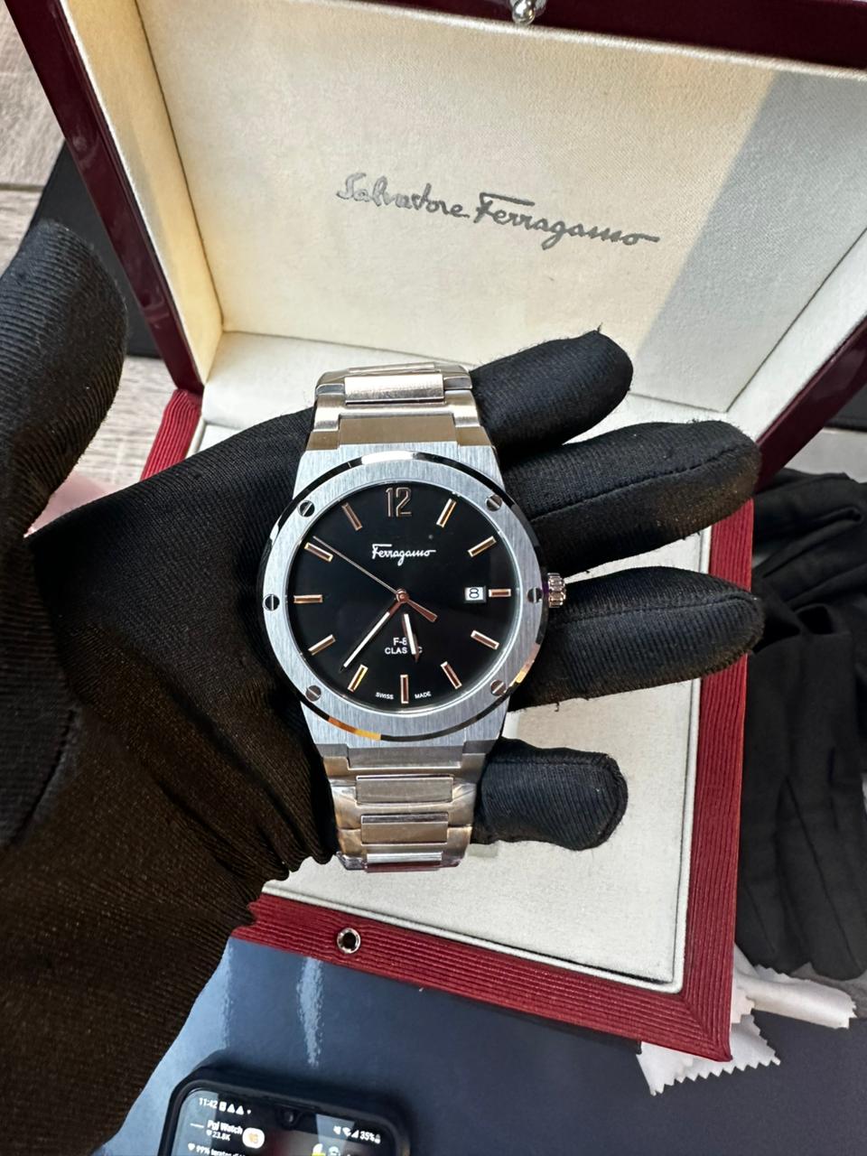 SALVATORE FERRAGAMO F-80 Quartz Classic Black Dial Silver Steel Strap Watch - SFDT01320